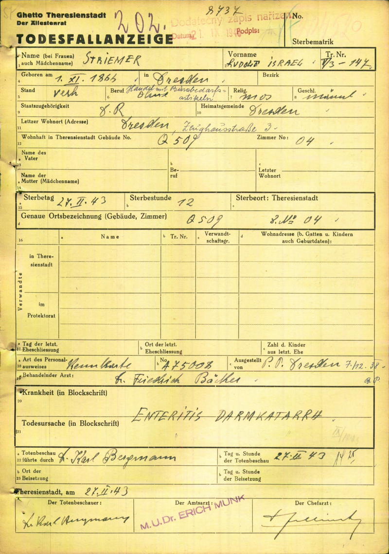 Striemer Rudolf: Death certificate, Ghetto Terezín
