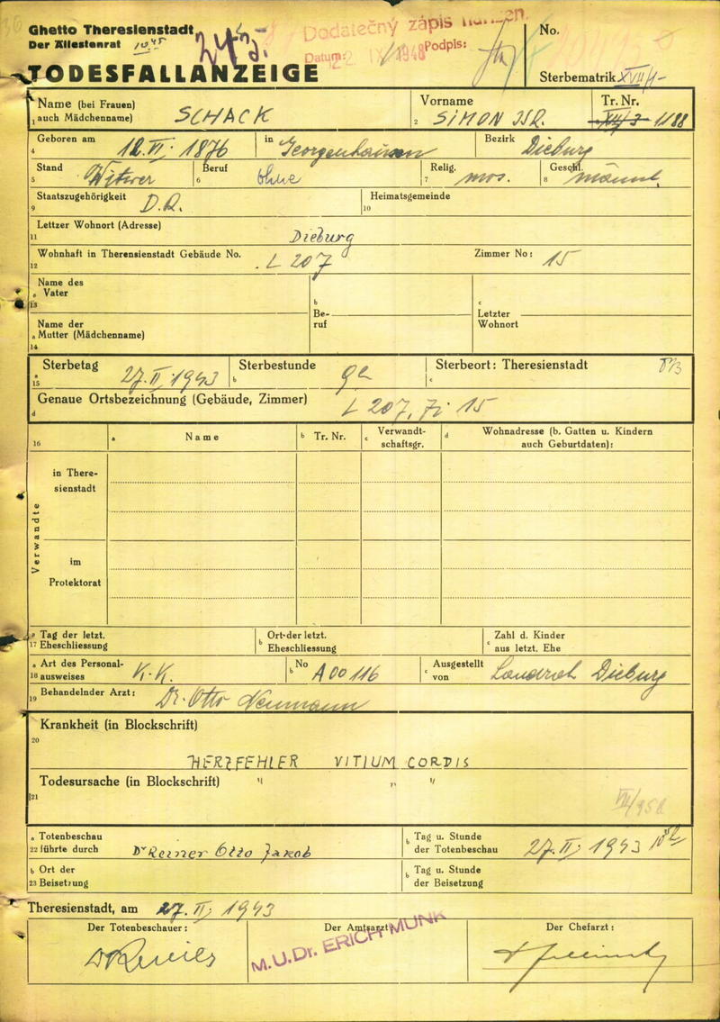 Schack Simon: Death certificate, Ghetto Terezín
