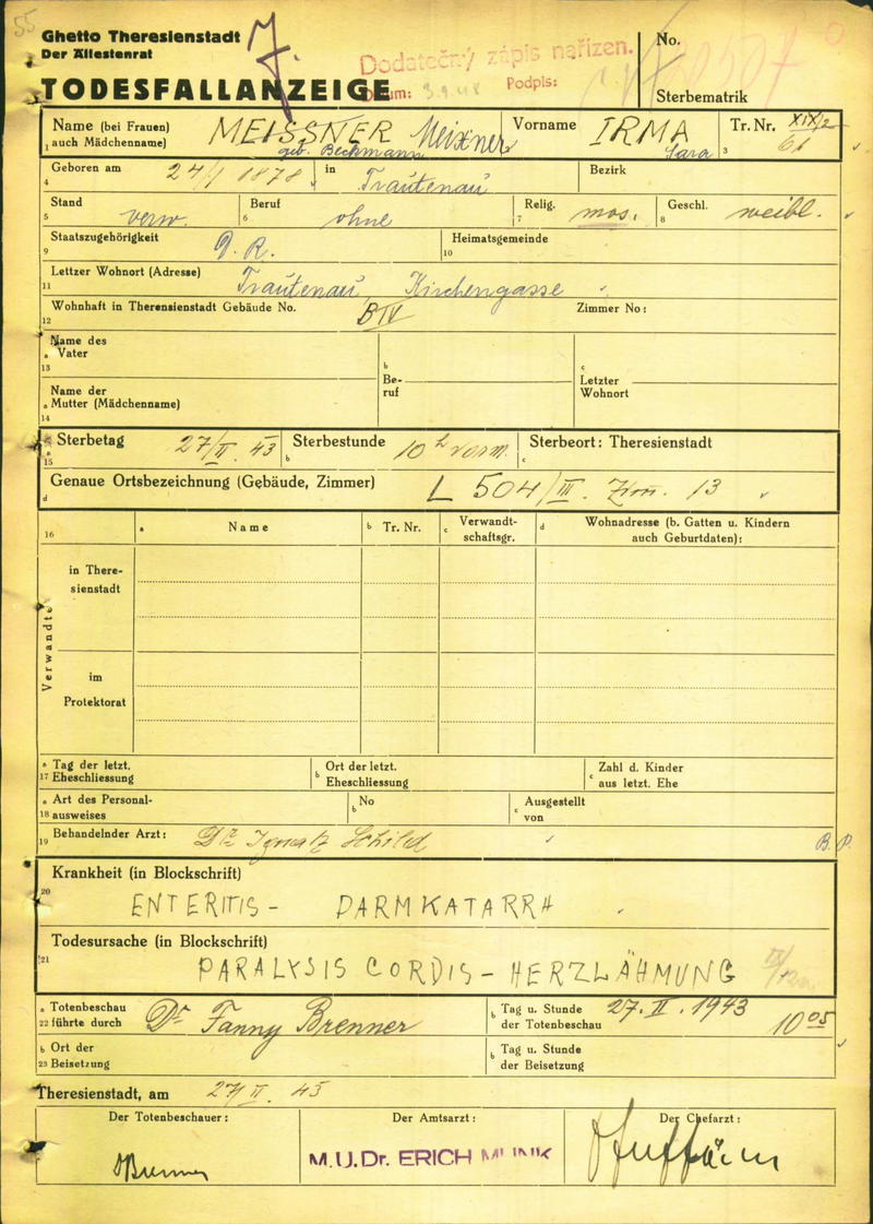 Meixnerová Irma: Death certificate, Ghetto Terezín