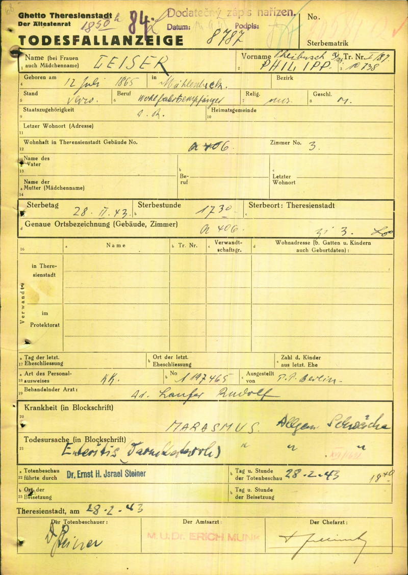 Leiser Phillip: Death certificate, Ghetto Terezín