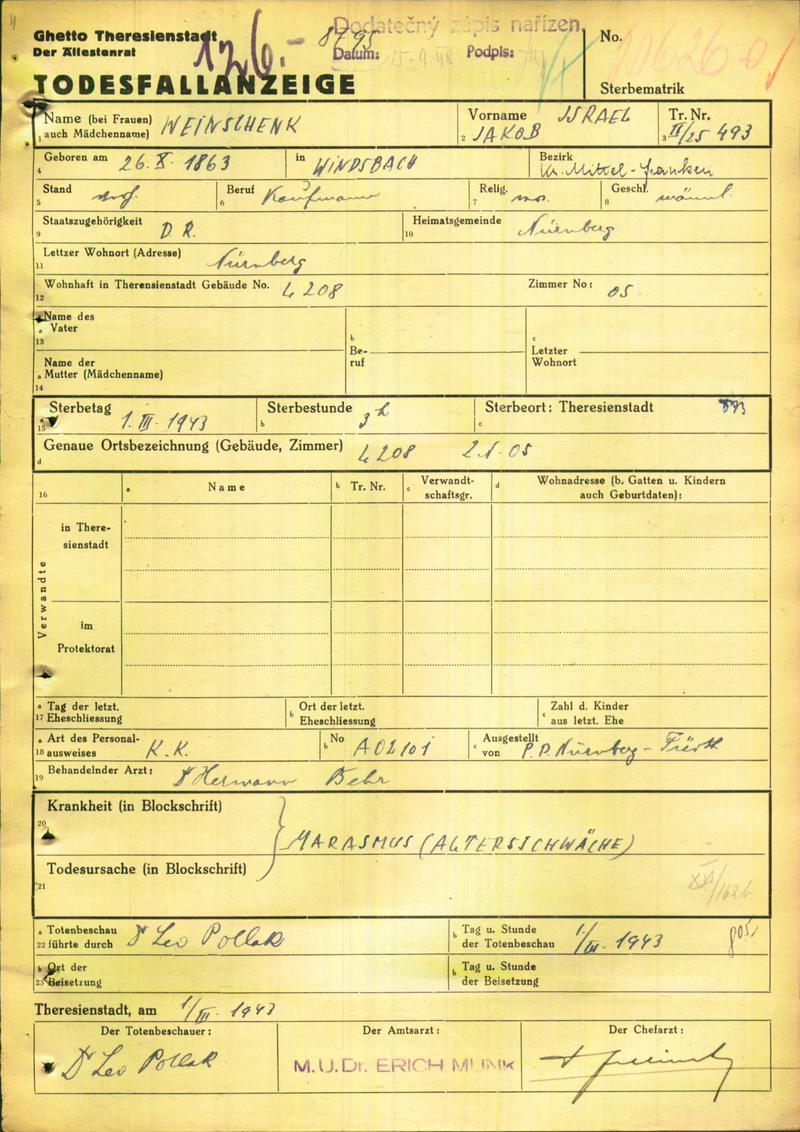 Weinschenk Jakob: Death certificate, Ghetto Terezín