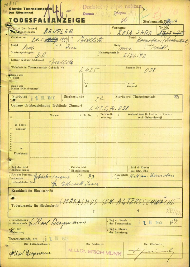 Beutlerová Rosa: Death certificate, Ghetto Terezín