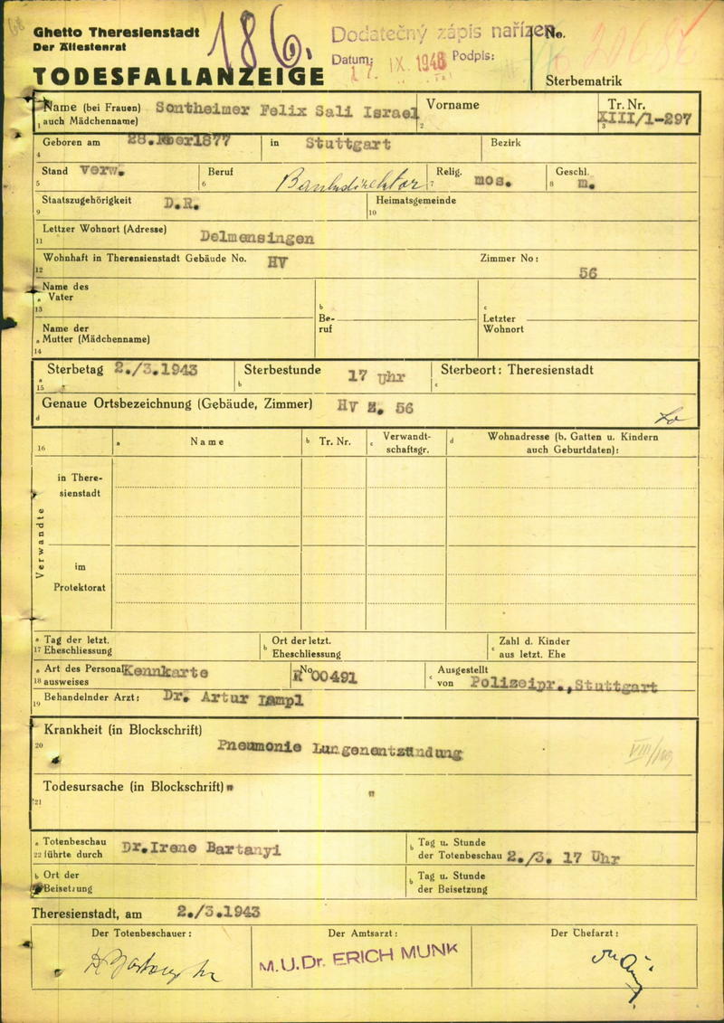 Sontheimer Felix: Death certificate, Ghetto Terezín