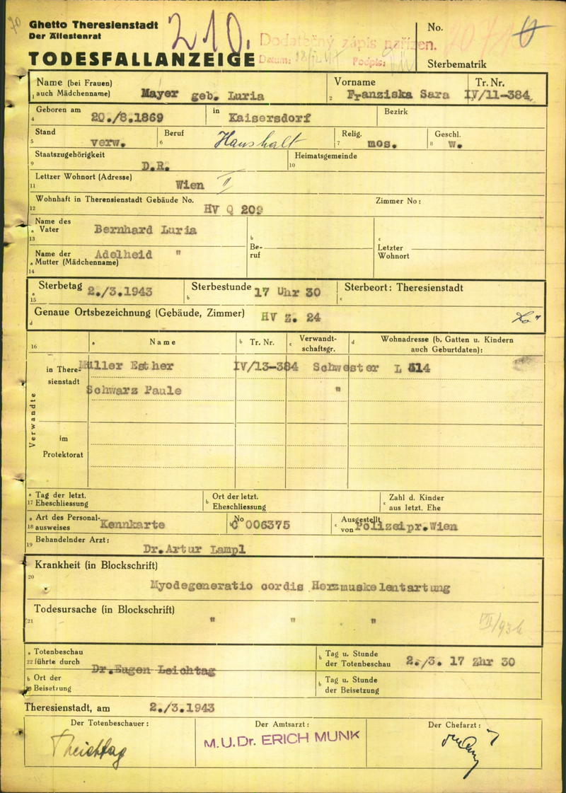 Mayer Franziska: Death certificate, Ghetto Terezín