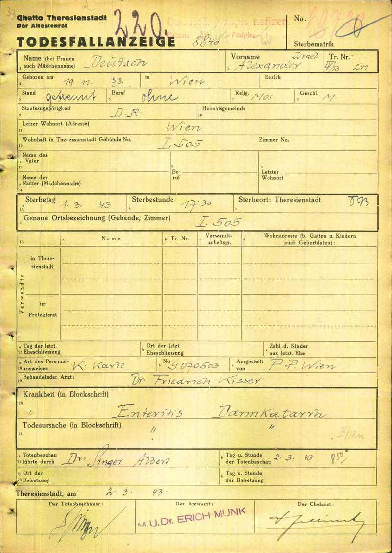 Deutsch Alexander: Death certificate, Ghetto Terezín
