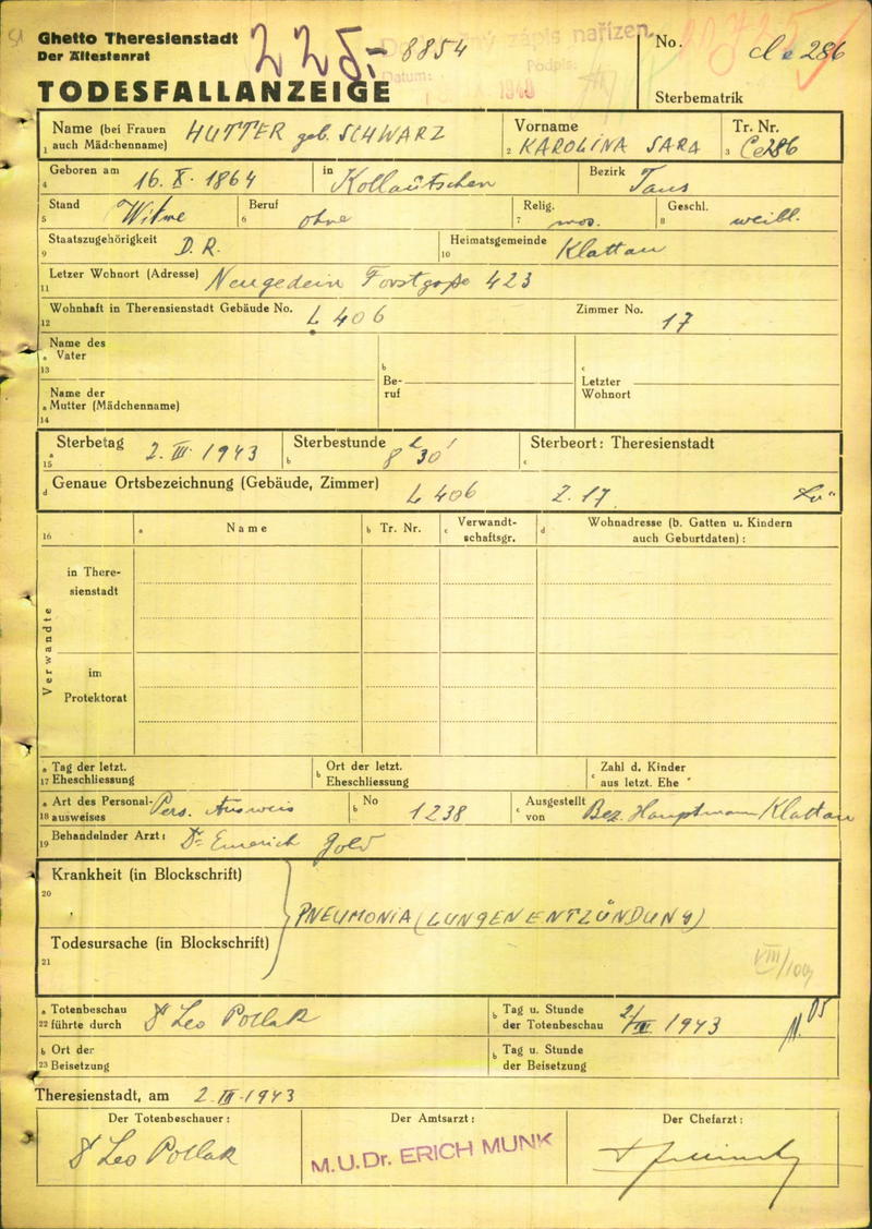 Hutterová Karolina: Death certificate, Ghetto Terezín