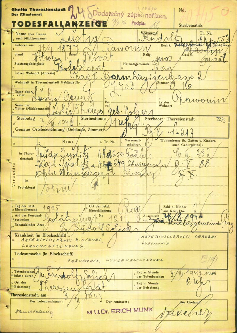 Lustig Rudolf: Death certificate, Ghetto Terezín