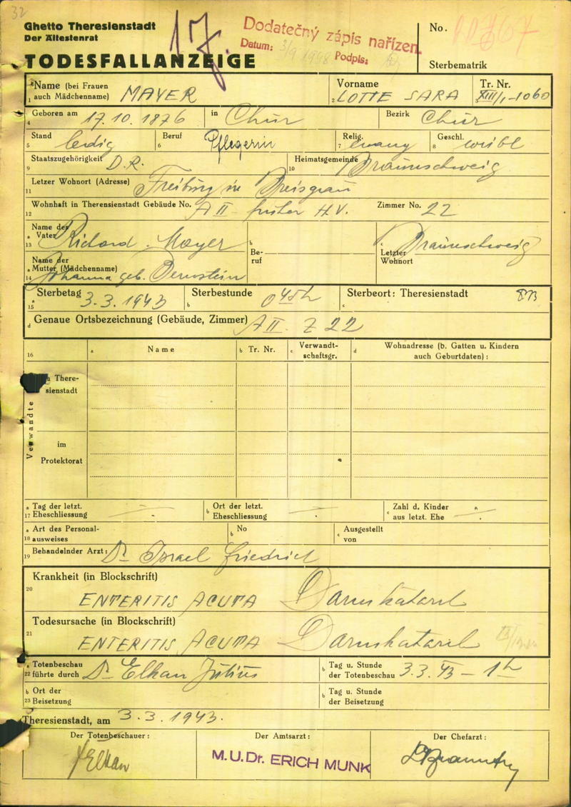 Meyer Lotte Lina: Death certificate, Ghetto Terezín