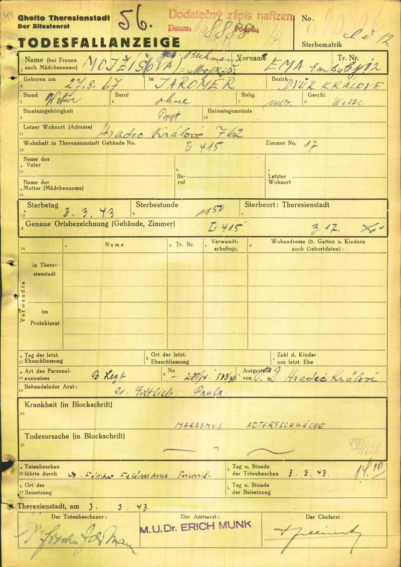 Mojžišová Emilie: Death certificate, Ghetto Terezín