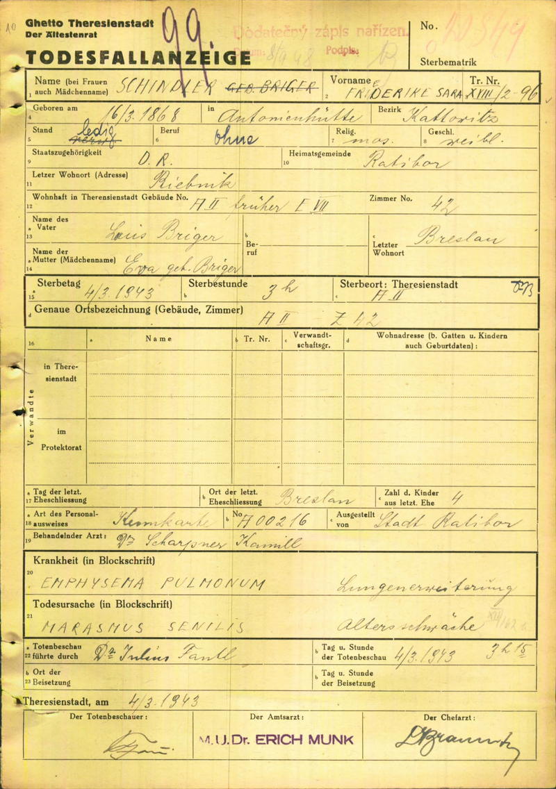 Schindler Friederike: Death certificate, Ghetto Terezín