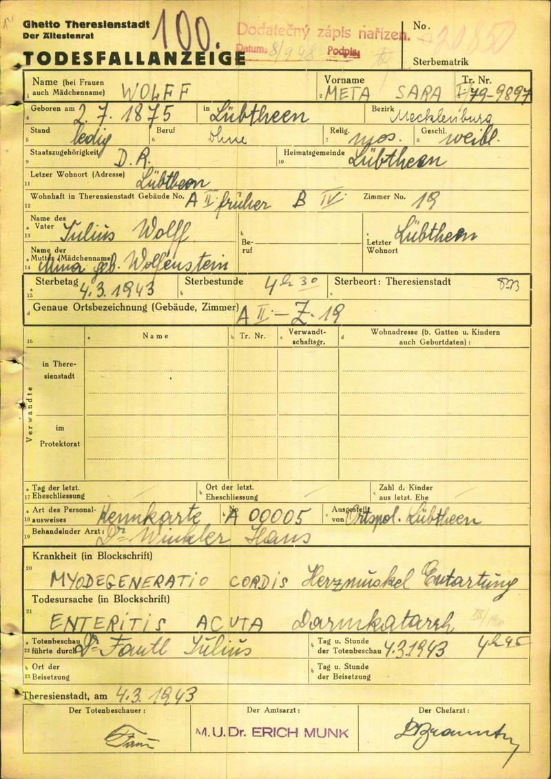 Wolff Meta: Death certificate, Ghetto Terezín