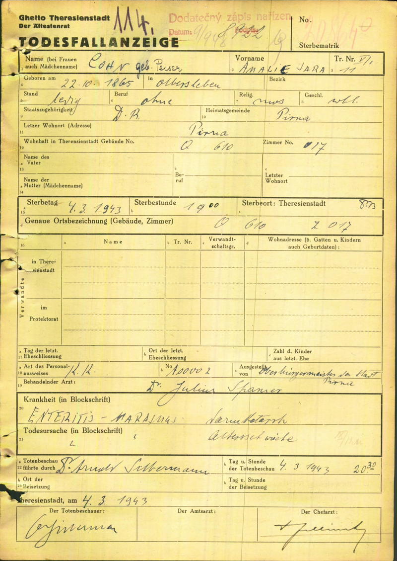 Cohn Amalie: Death certificate, Ghetto Terezín
