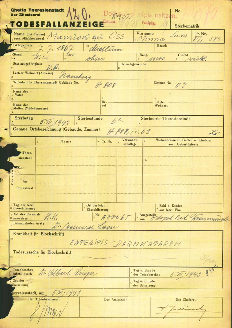 Mamlok Minna: Death certificate, Ghetto Terezín