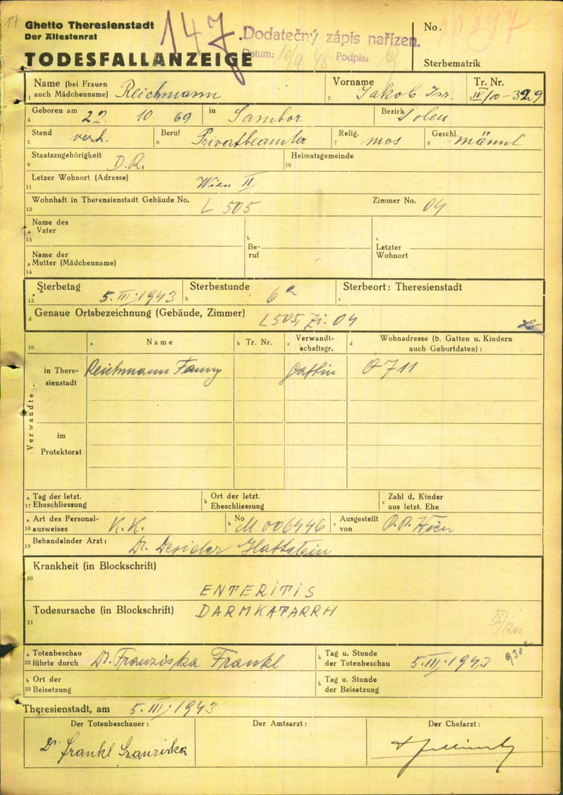 Reichmann Jakob: Death certificate, Ghetto Terezín