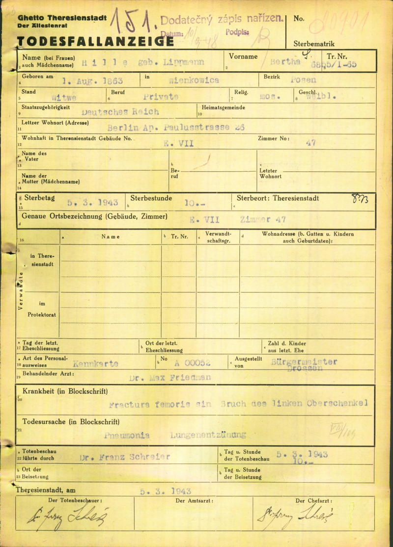 Hillel Bertha: Death certificate, Ghetto Terezín