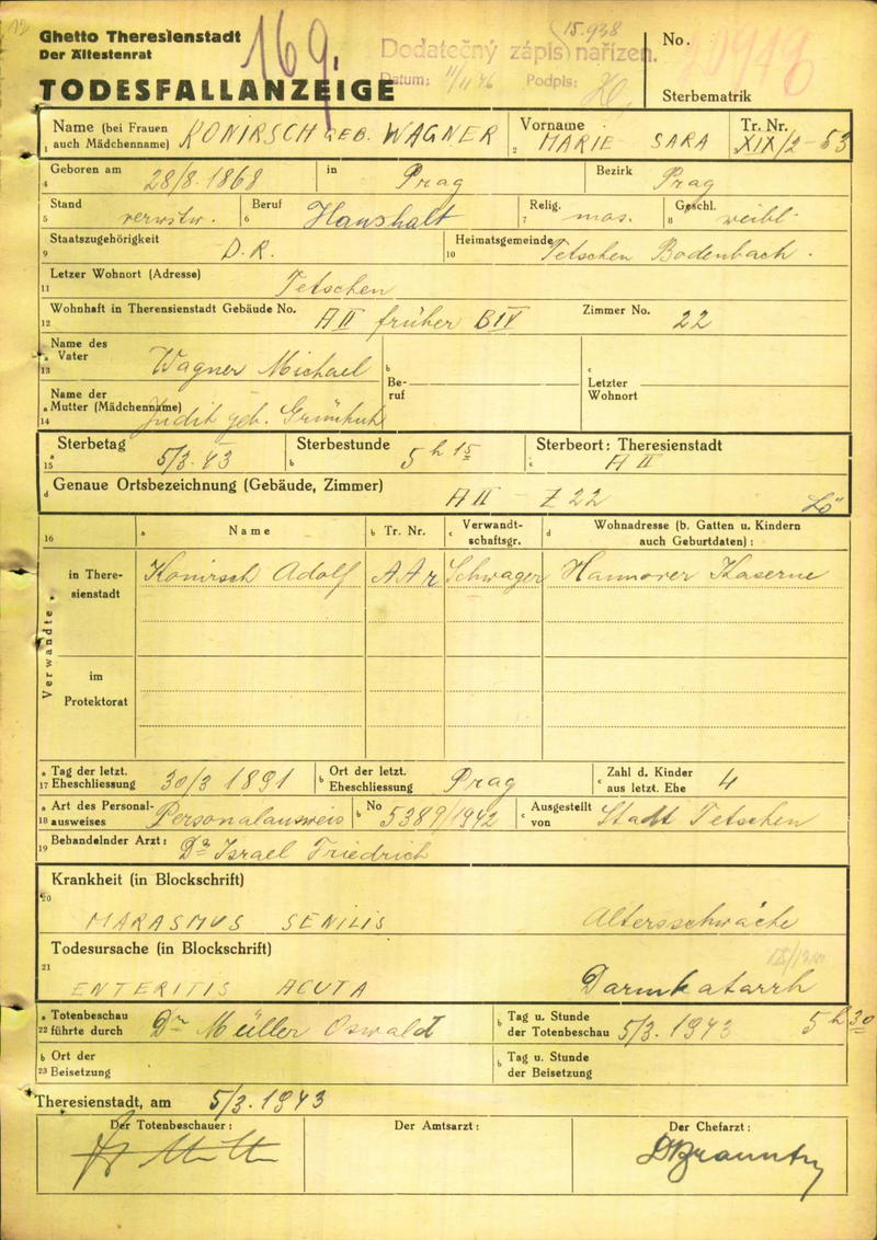 Konirschová Marie: Death certificate, Ghetto Terezín