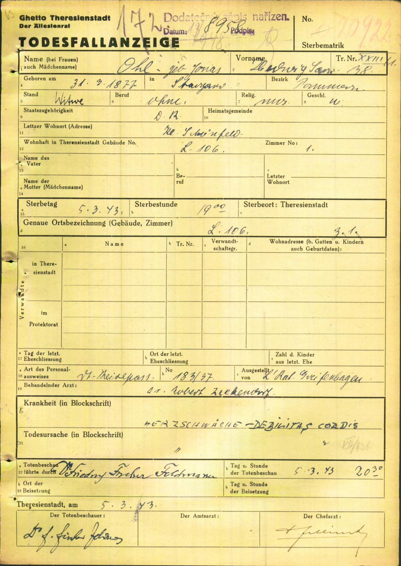 Ohl Hedwig: Death certificate, Ghetto Terezín