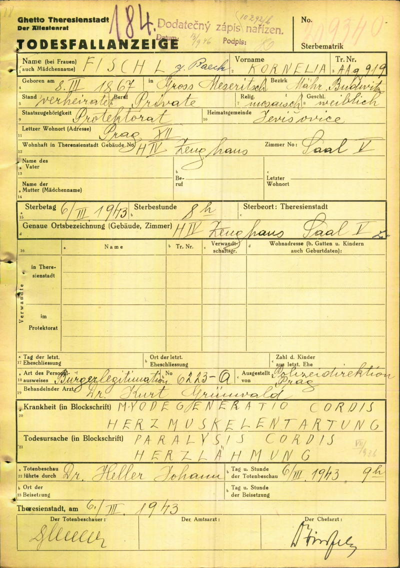 Fischlová Kornelie: Death certificate, Ghetto Terezín