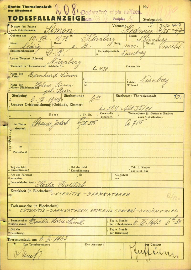 Simon Hedwig: Death certificate, Ghetto Terezín