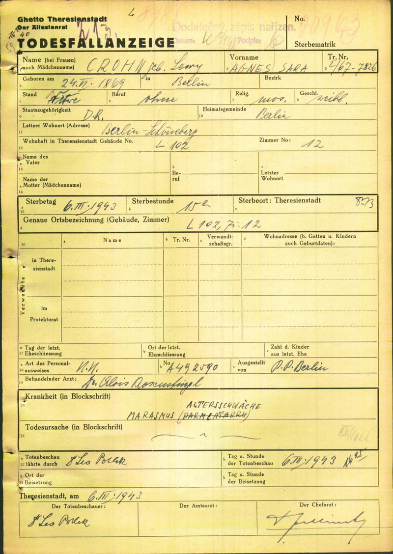 Crohn Agnes: Death certificate, Ghetto Terezín