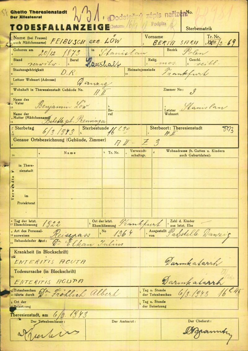 Feibusch Berta: Death certificate, Ghetto Terezín