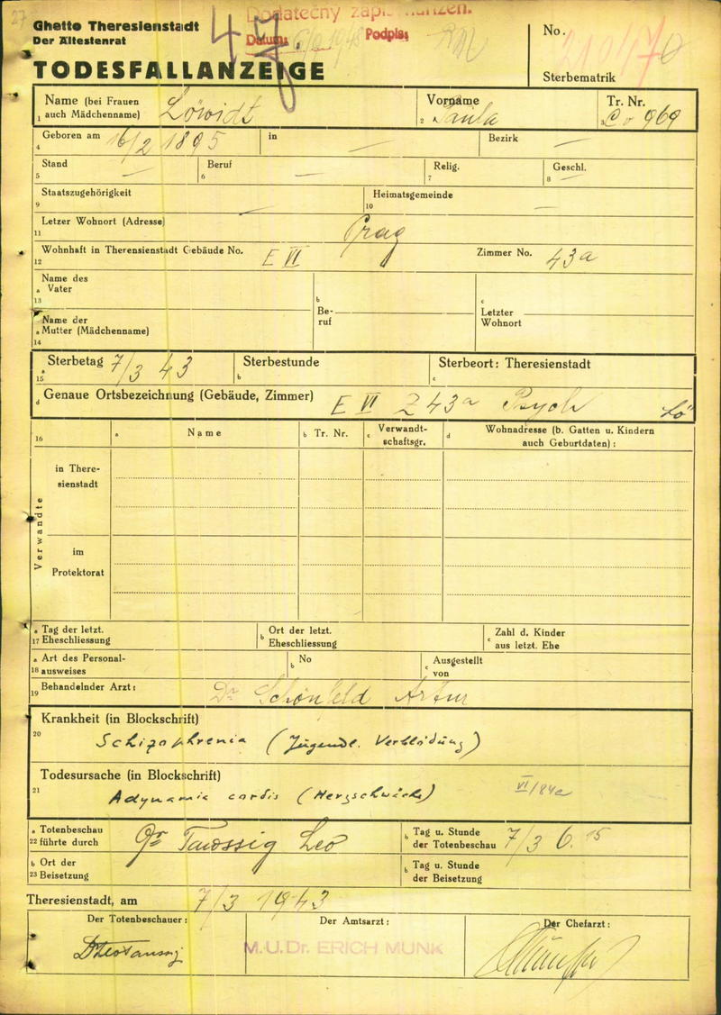 Löwidtová Pavla: Death certificate, Ghetto Terezín