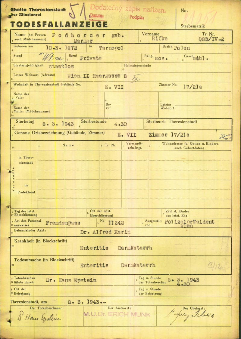 Podhorcer Rifke: Death certificate, Ghetto Terezín