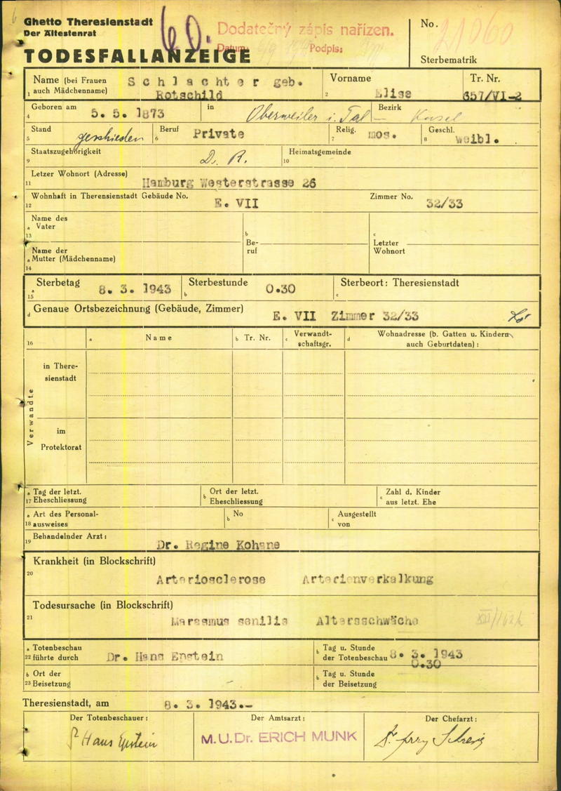 Schlachter Elisabeth: Death certificate, Ghetto Terezín