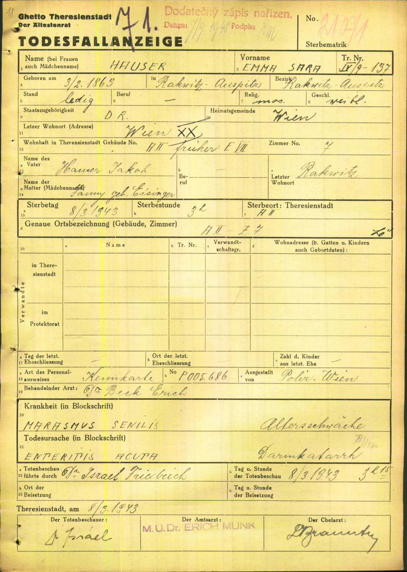 This database contains the names and fates of those who were deported from the territory of today’s Czech Republic, be it their homeland or may they have been deported to the Theresienstadt ghetto before from different european countries. Further, it contains basic information on those men, women and children, most of whom were Roma or Sinti, who died as prisoners of the so-called „Gypsy camp I“ Lety u Písku.