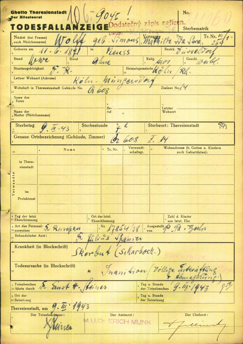 Wolff Mathilde: Death certificate, Ghetto Terezín