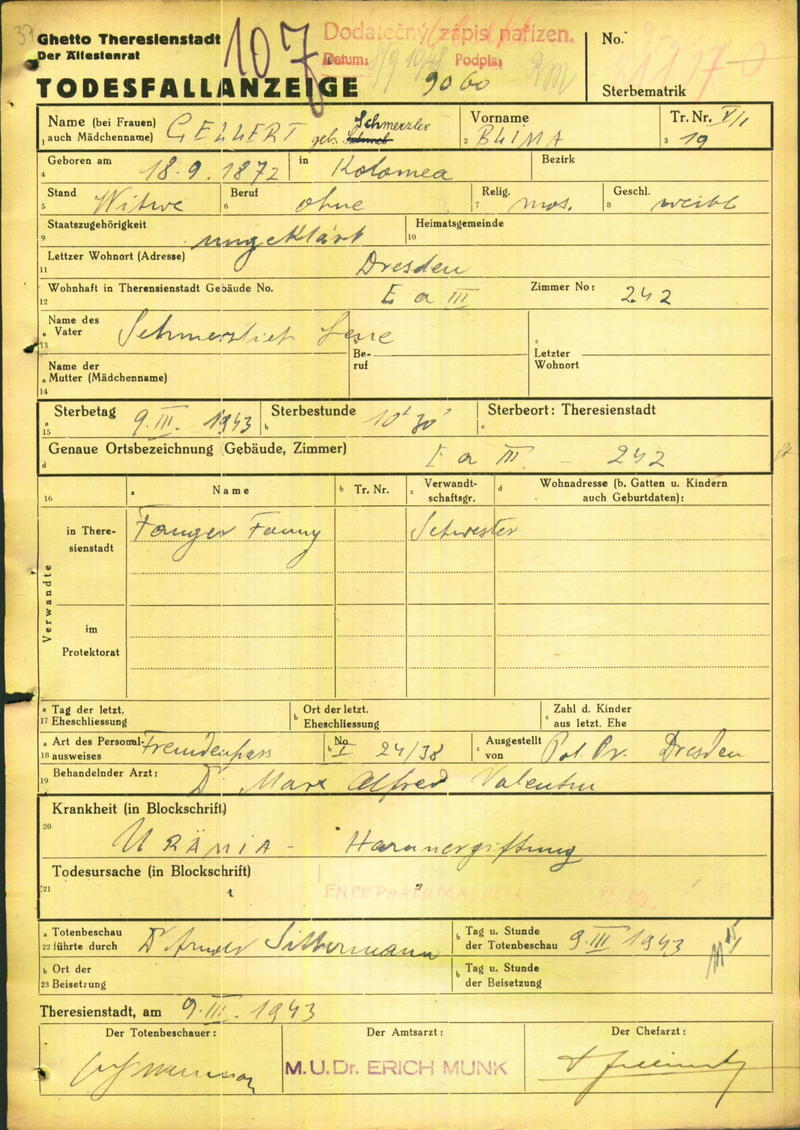 Gellert Blima: Death certificate, Ghetto Terezín