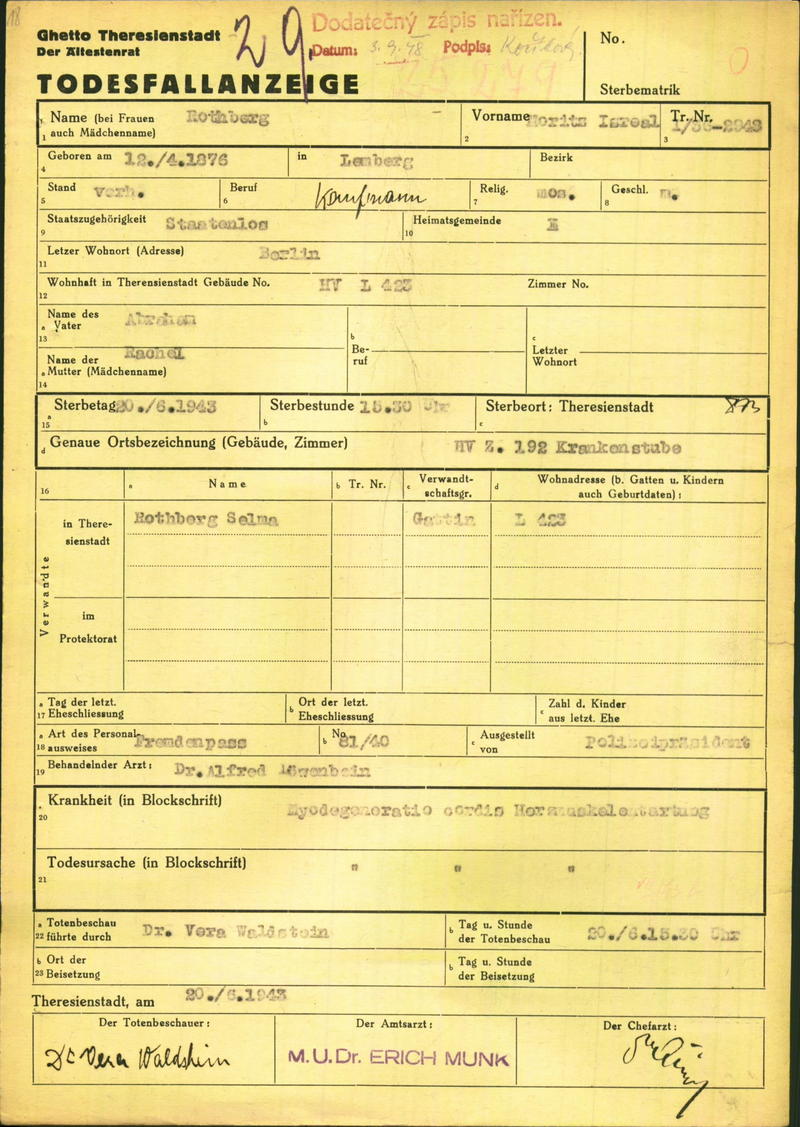 Rothberg Moritz: Death certificate, Ghetto Terezín