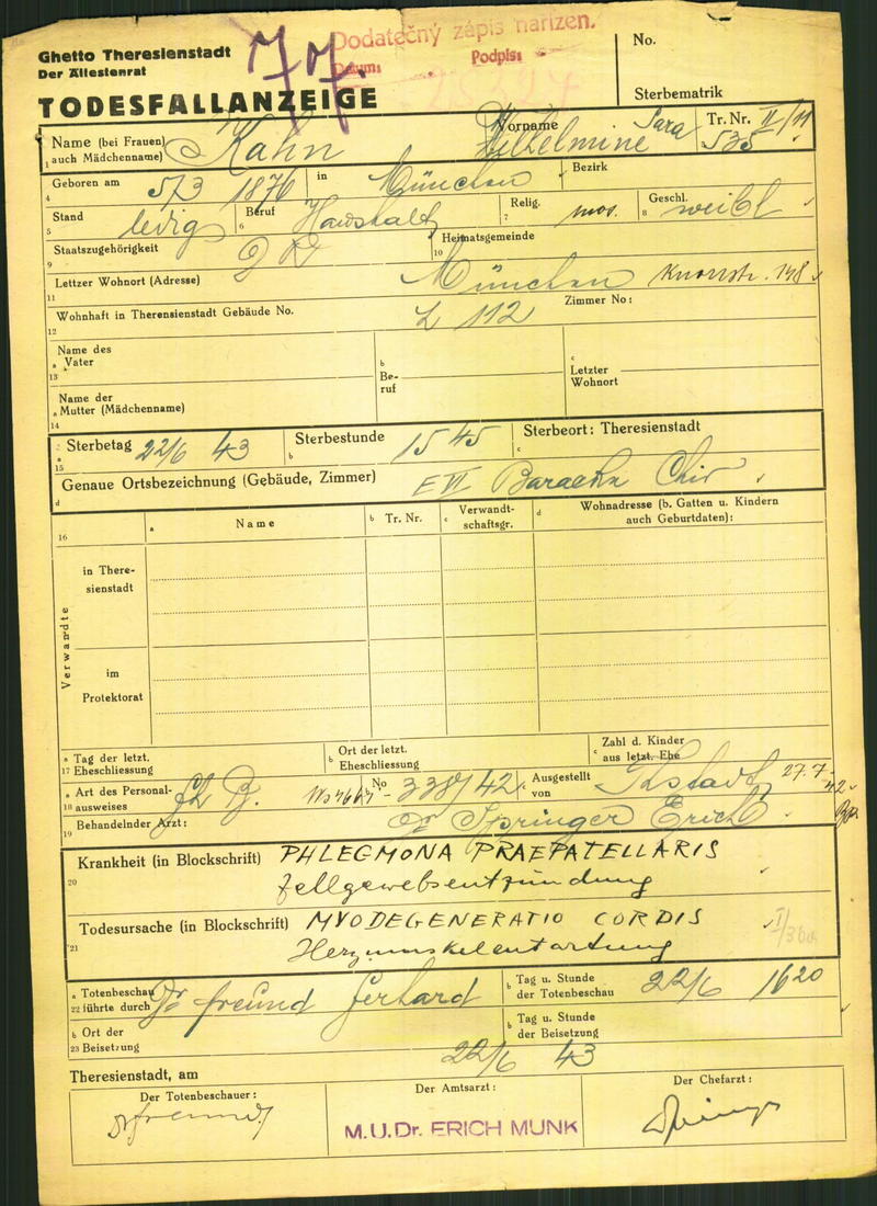 Kahn Wilhelmine: Death certificate, Ghetto Terezín