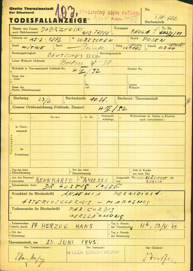 Dobrzynski Paula: Death certificate, Ghetto Terezín