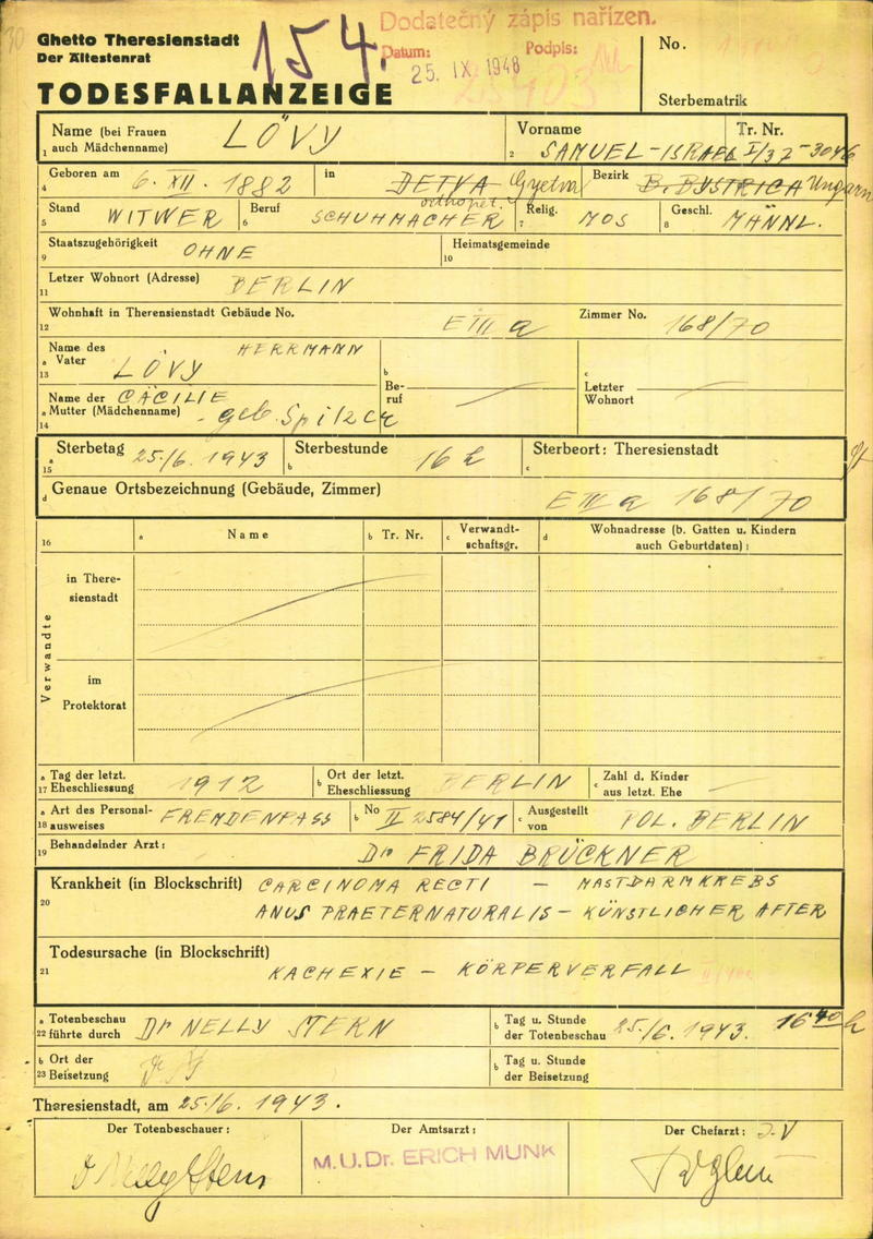 Lövy Samuel: Death certificate, Ghetto Terezín