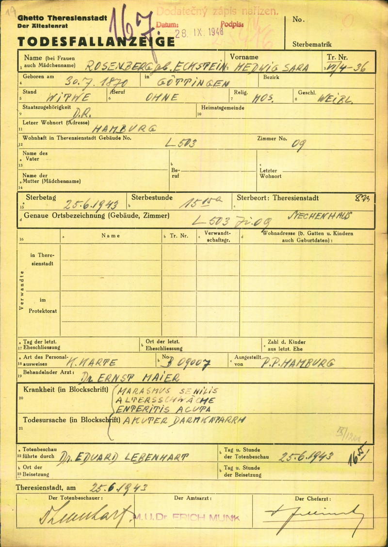 Rosenberg Hedwig: Death certificate, Ghetto Terezín