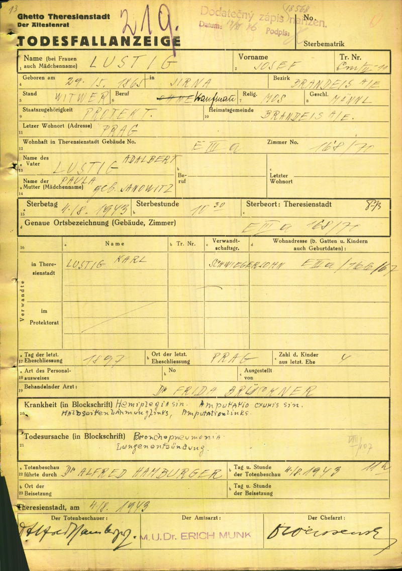 Lustig Josef: Death certificate, Ghetto Terezín