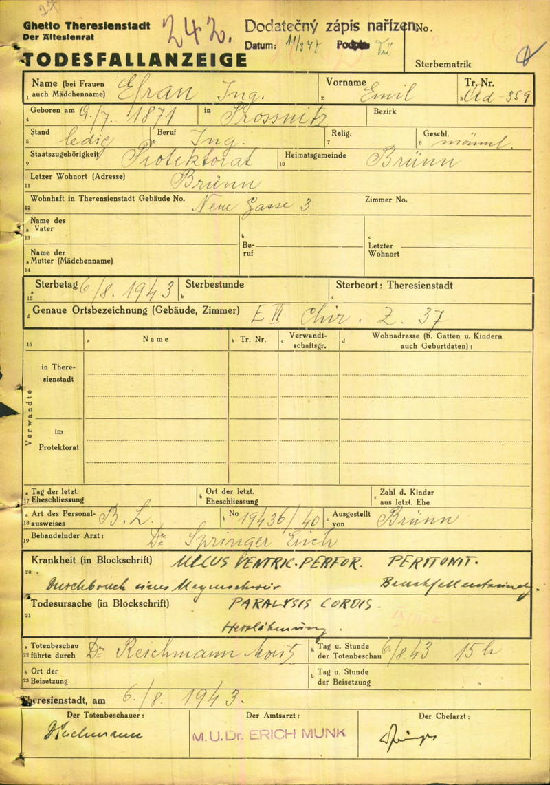 Efran Emil: Death certificate, Ghetto Terezín