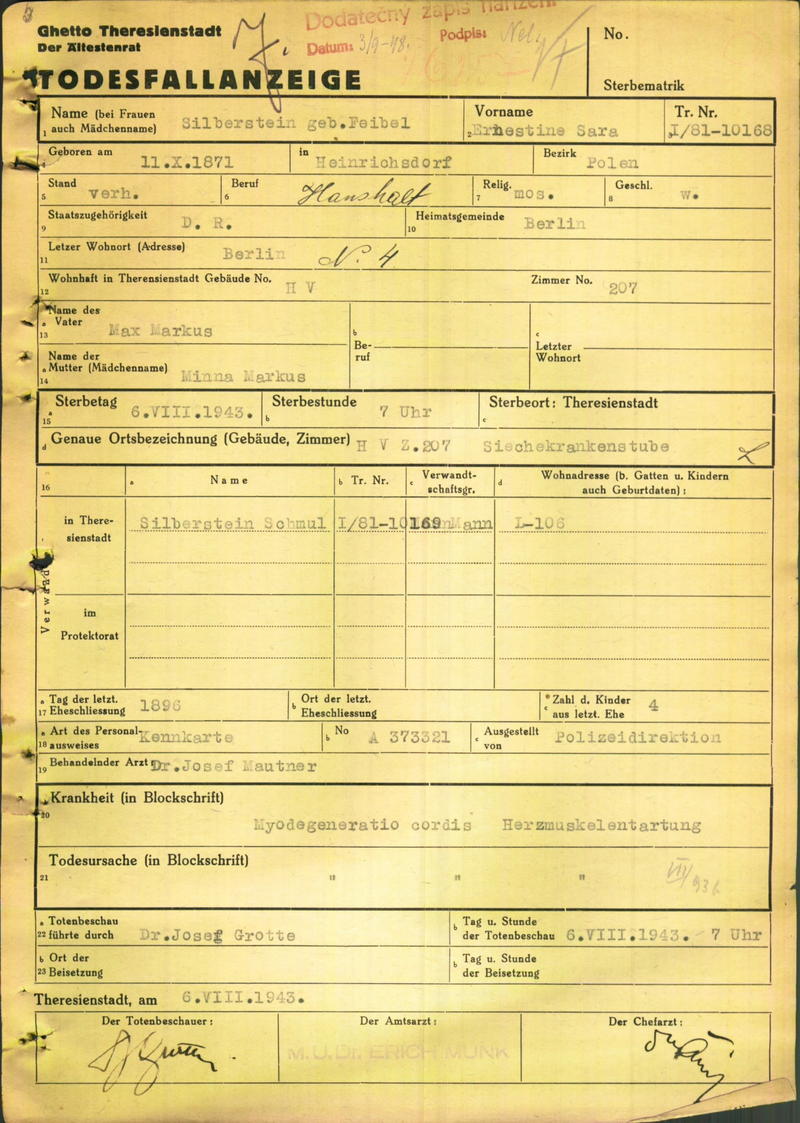 Silberstein Ernestine: Death certificate, Ghetto Terezín