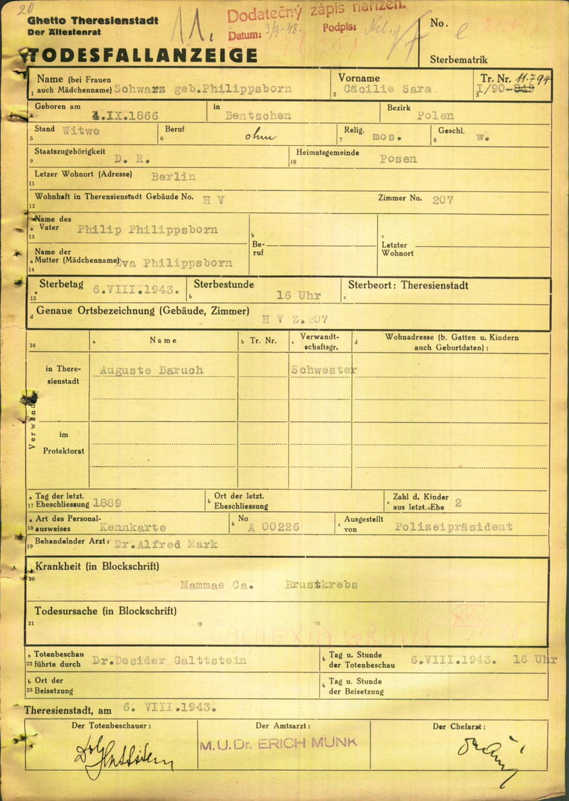 Schwarz Cäcilie: Death certificate, Ghetto Terezín
