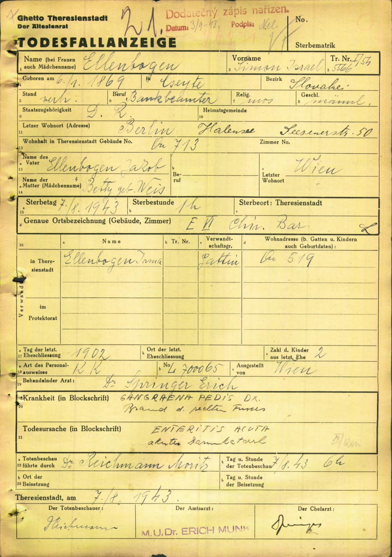 Ellenbogen Simon: Death certificate, Ghetto Terezín