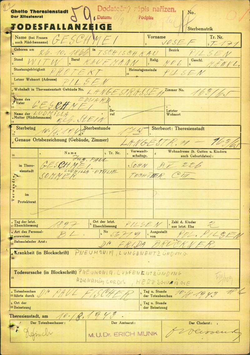 Geschmay Josef: Death certificate, Ghetto Terezín