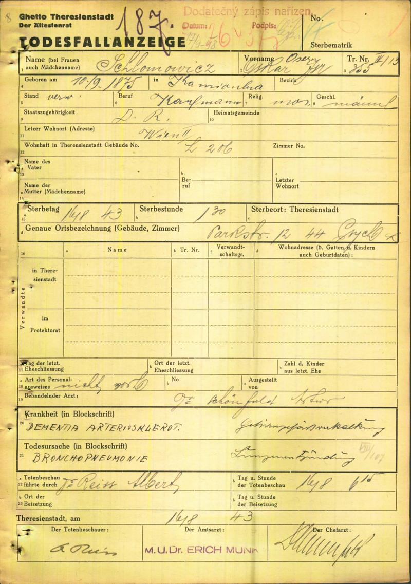 Schlomowicz Oser Oskar: Death certificate, Ghetto Terezín