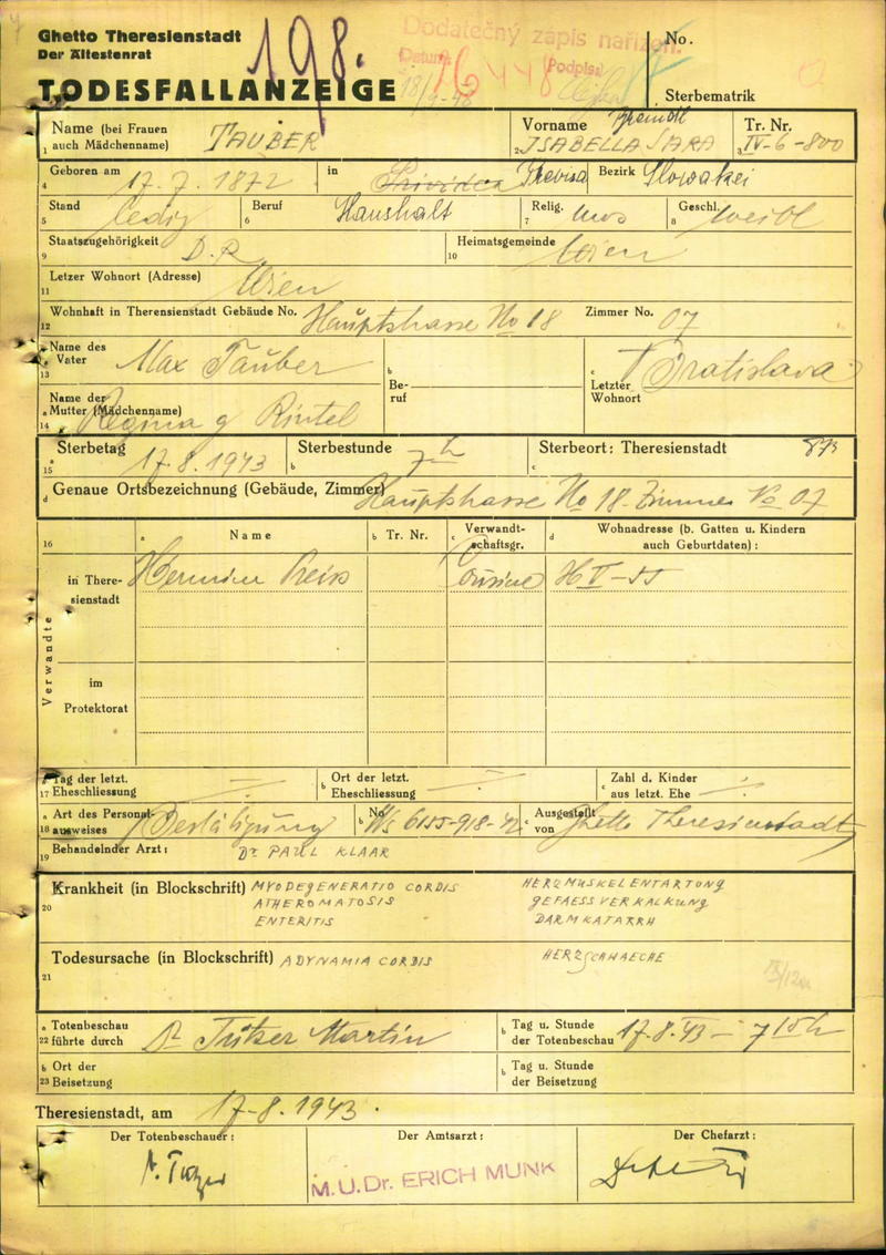 Tauber Isabella Breindl: Death certificate, Ghetto Terezín