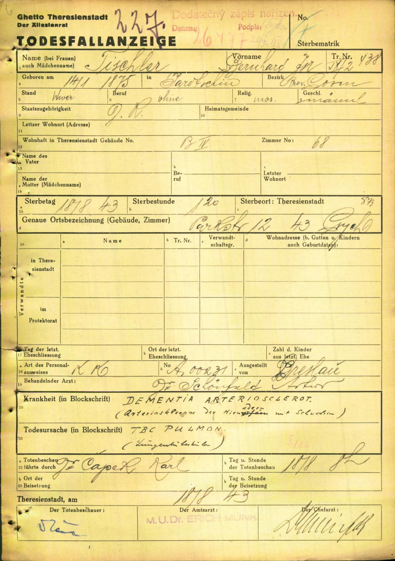 Tischler Bernhard: Death certificate, Ghetto Terezín