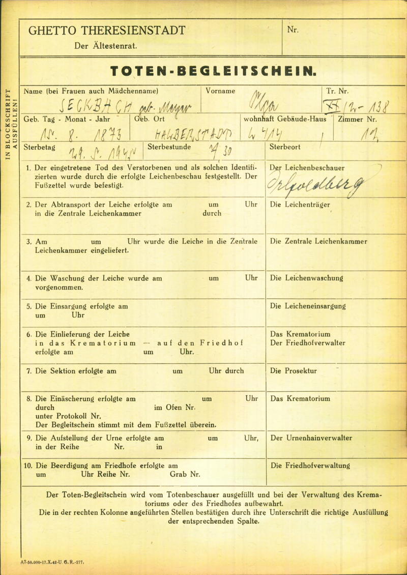Seckbach Olga: Death certificate, Ghetto Terezín
