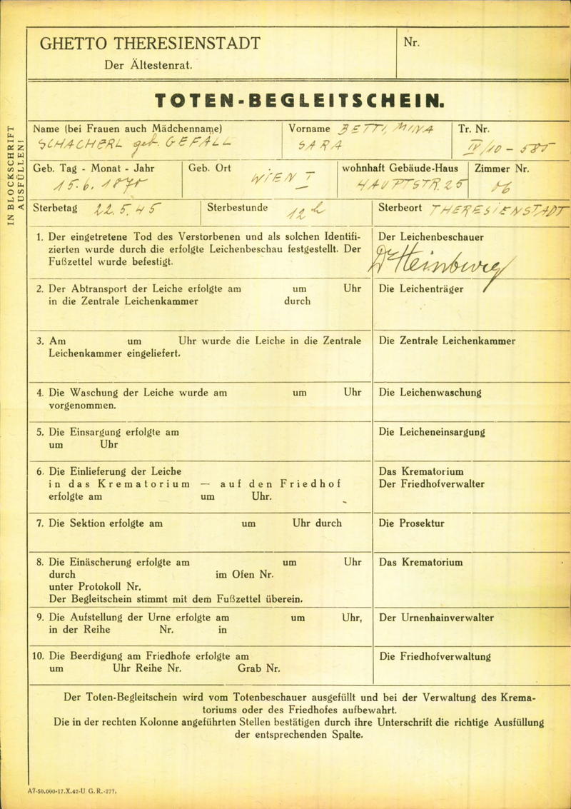 Schacherl Betti Mina: Death certificate, Ghetto Terezín