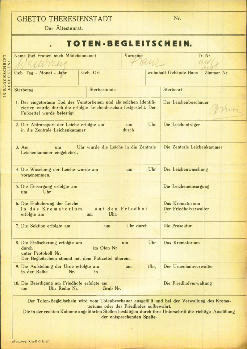 Wasserzug Franz: Death certificate, Ghetto Terezín