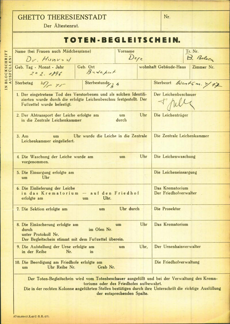 Hunvod Deszö: Death certificate, Ghetto Terezín