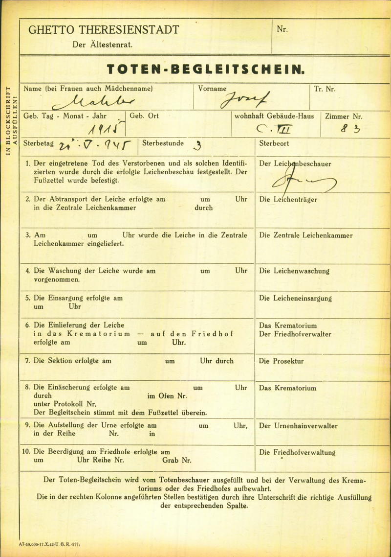 Mahler Josef: Death certificate, Ghetto Terezín